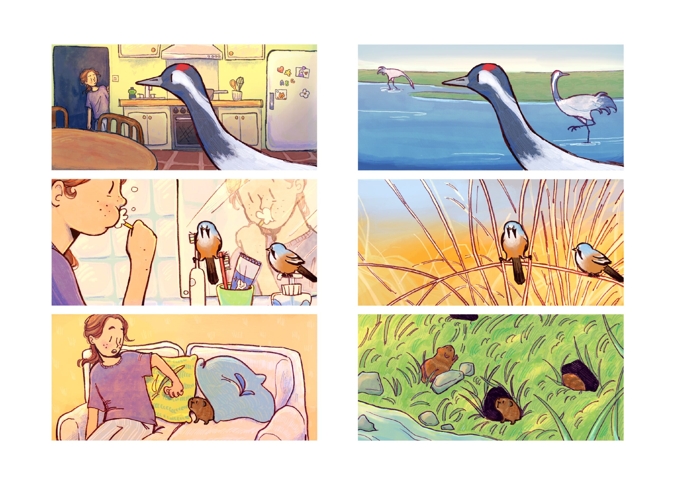 'There's a Crane in the Kitchen!' was created for an exhibition based around the UN Climate Action Goals. I presented an activity based on a concept for a children’s book in which the main character wakes up one morning to find her house full of displaced wetland animals and embarks on a journey to find them suitable homes. I want to encourage awareness and enthusiasm for wetland ecosystems.